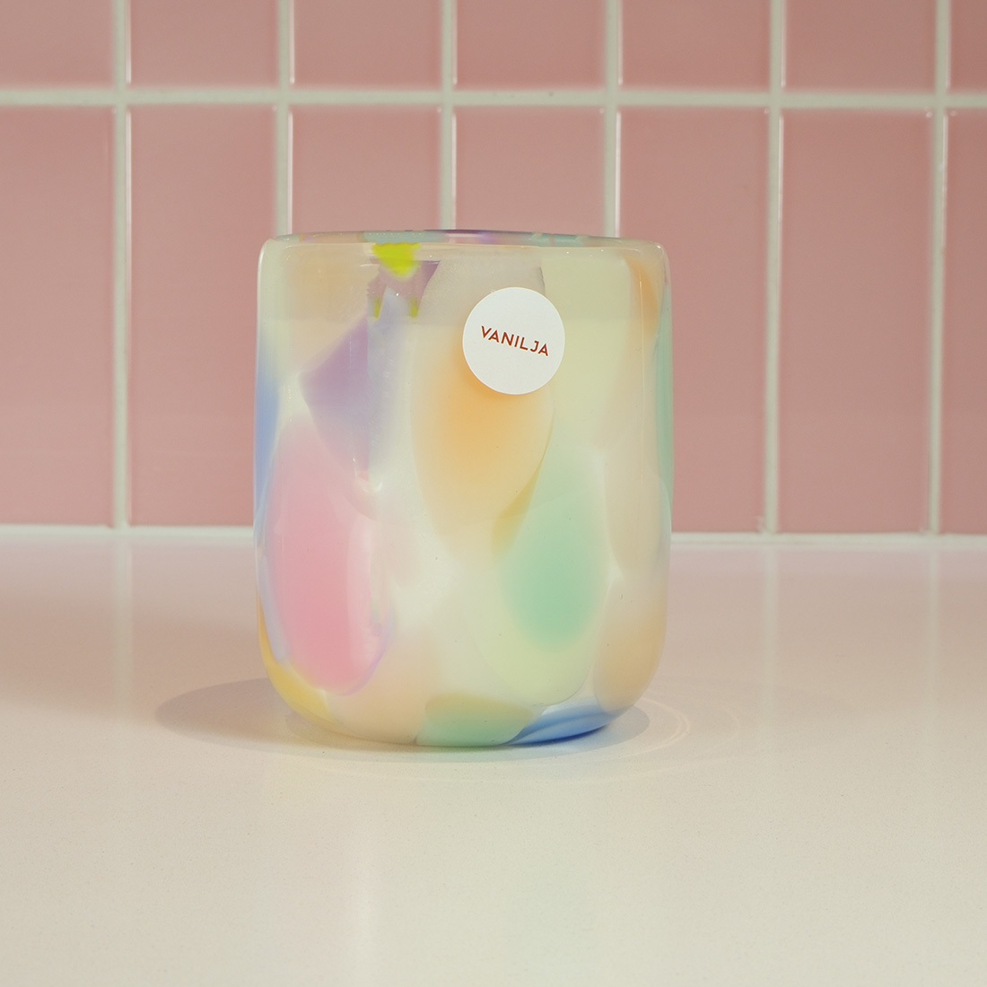 Jokainen lasi on omanlaisensa, ja sarjan lasien koot ja värit vaihtelevat kauniisti. Kynttilä on valettu ekologisesta oliiviöljyvahasta omalla pajallamme Kustavissa. Upeat tuoksut viimeistelevät elämyksen.