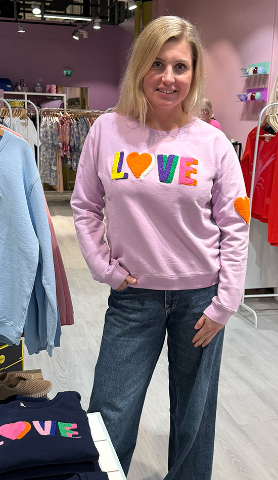 Raikas vaaleanliila collegepaita, jossa näyttävä monivärinen LOVE-brodeeraus.