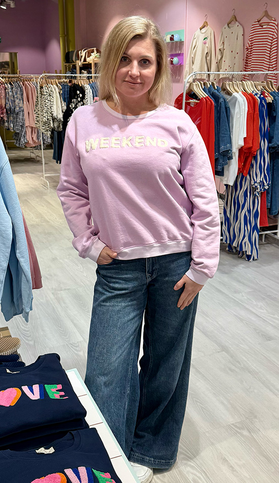 Raikas vaaleanliila collegepaita, jossa näyttävä monivärinen WEEKEND-brodeeraus.