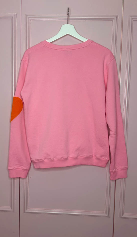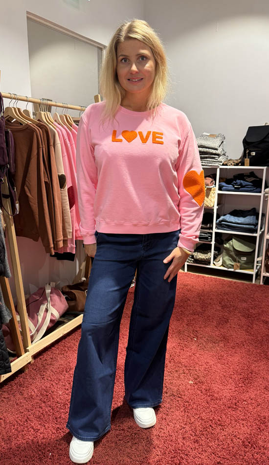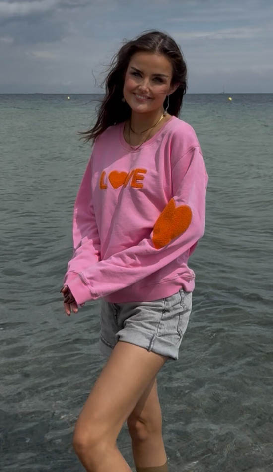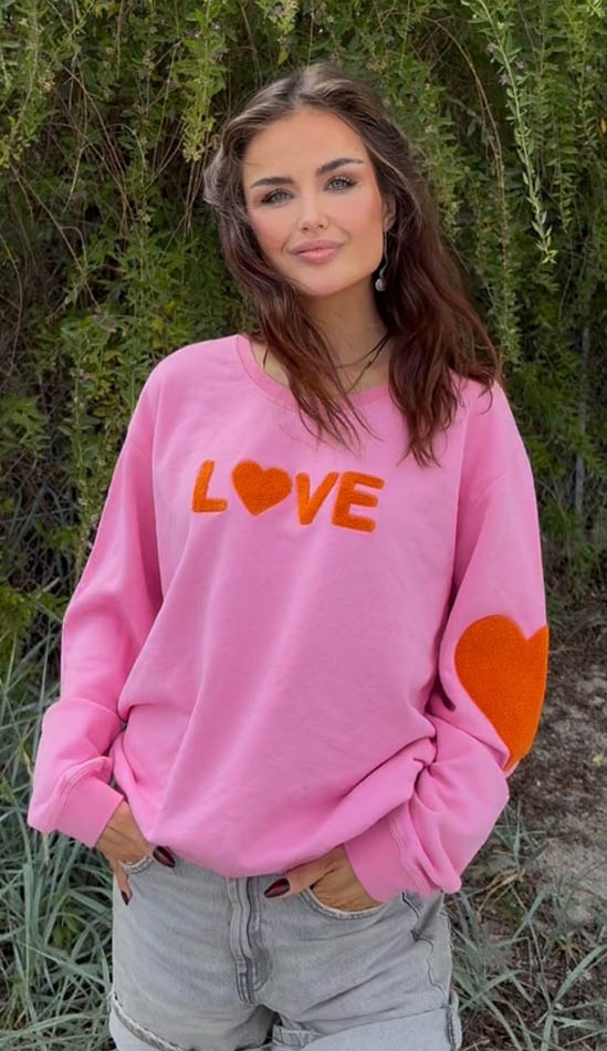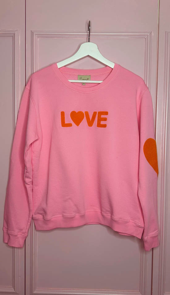 Raikas pinkki collegepaita, jossa näyttävä oranssinvärinen LOVE-brodeeraus.